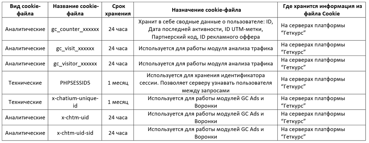 Cookie-файлы устанавливаются Платформой «Геткурс» согласно информации, указанной в таблице: