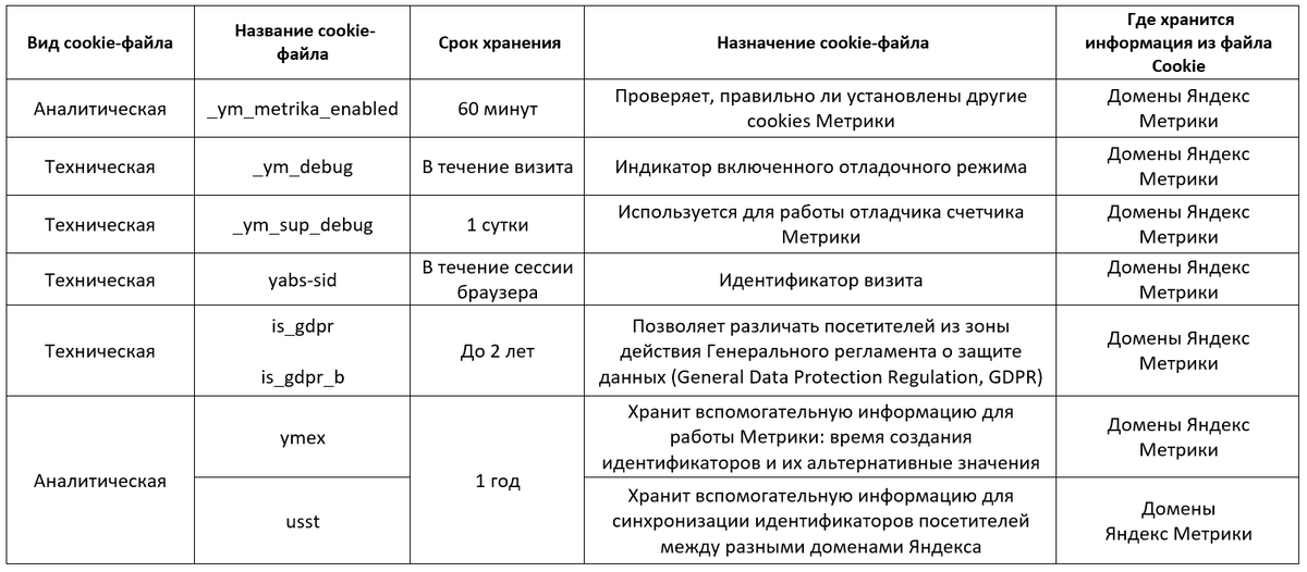 Яндекс.Метрика устанавливает временные файлы и предоставляет обезличенную информацию о посещаемости сайта и использует анонимные идентификаторы браузеров, которые сохраняются в cookie, а также в localStorage-свойства.